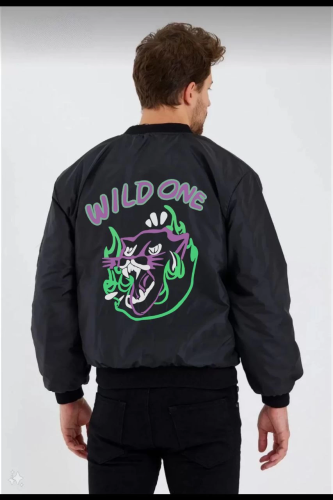 • Unisex Uzun Kol Baskılı Bomber Ceket Siyah
