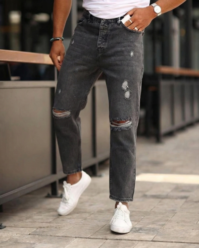 Erkek Koyu Gri Yırtık Detaylı Boyfriend Jean
