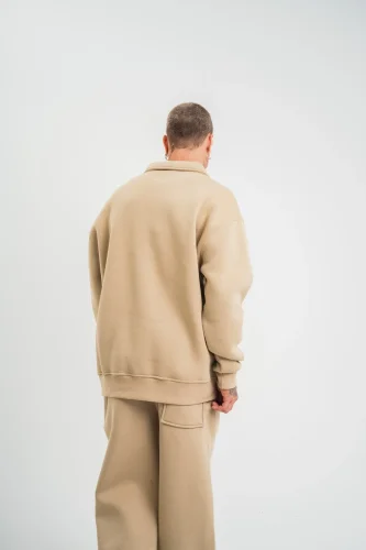 • Erkek Patlı Yaka Üç İplik Pamuklu Sweatshirt Double Oversize Rahat Kalıp Günlük Kullanım Bej