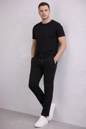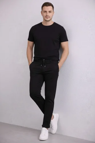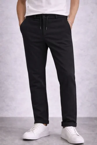 • Erkek Diagonel Mikro dokulu Duble Paça Cepli Pantolon Bağcıklı Bel Modern Kesim Siyah