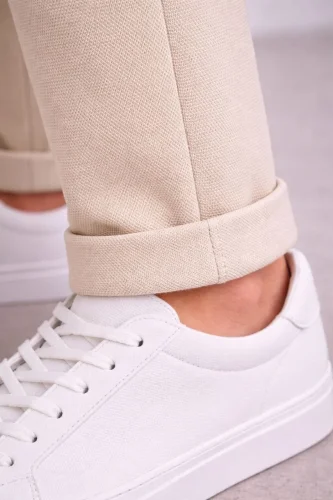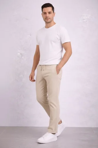 • Erkek Diagonel Mikro dokulu Duble Paça Cepli Pantolon Bağcıklı Bel Modern Kesim Krem