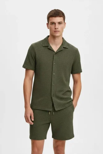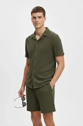 Erkek Waffle Kumaş Kısa Kollu Gömlek Şort Takım Regular Fit Yazlık İkili Set Haki