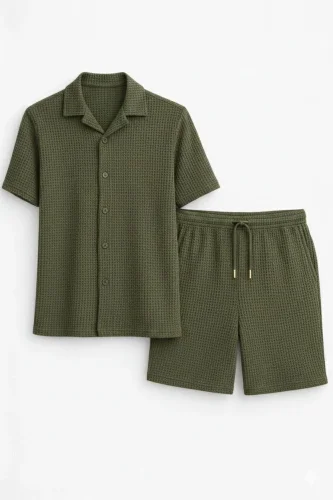 • Erkek Waffle Kumaş Kısa Kollu Gömlek Şort Takım Regular Fit Yazlık İkili Set Haki
