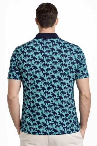 Erkek Pike Kumaş Polo Yaka Palmiye Desenli Tişört Kısa Kol Yazlık TShirt Turkuaz